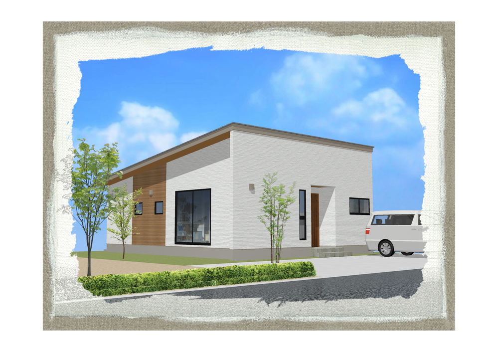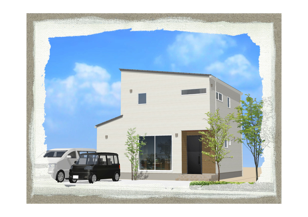 ホワイトのガルバリウム(またはサイディング)を基調とした、清潔感あふれる外観。シャープな片流れ屋根が都会的な印象を与えつつ、玄関まわりにあしらった温かみのある木目調のアクセントが、帰宅する家族を優しく迎え入れます。飽きのこないデザインは、街並みにも美しく馴染みます。