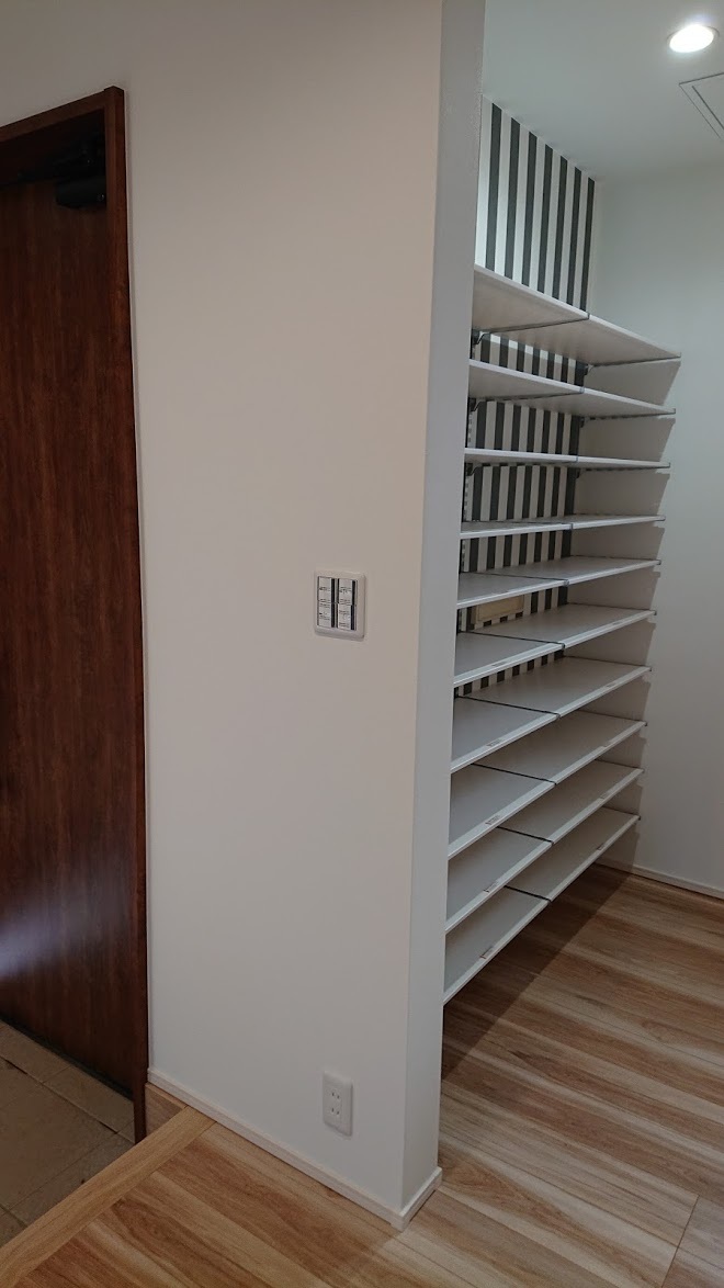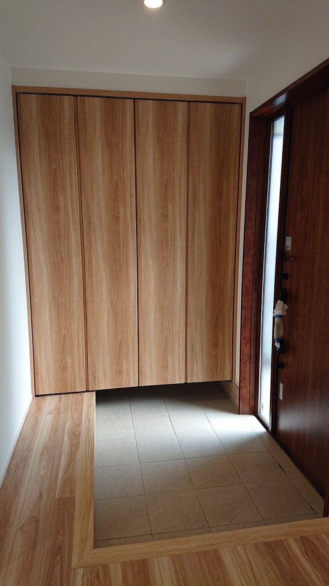 玄関ホールには、大容量の土間クローゼット フローリング部分をL型にしたことで、 家族が並んで靴を履けるスペースに♪