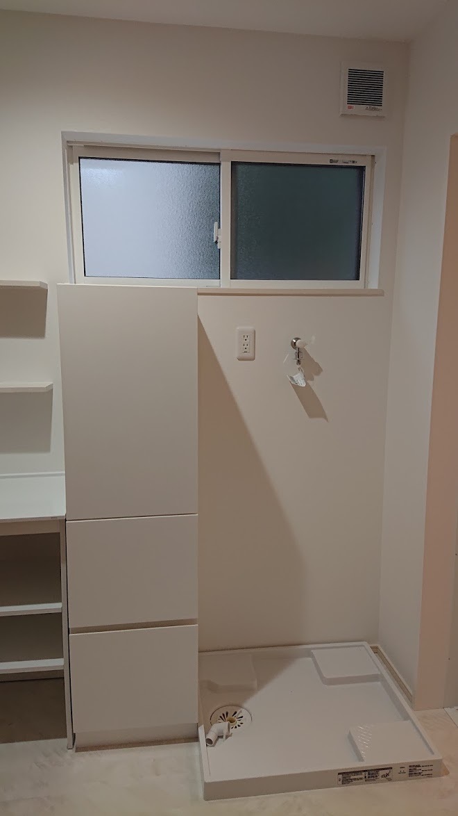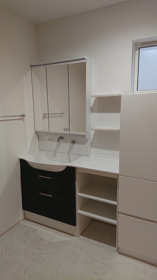 洗面脱衣室にも造作の収納棚を♪