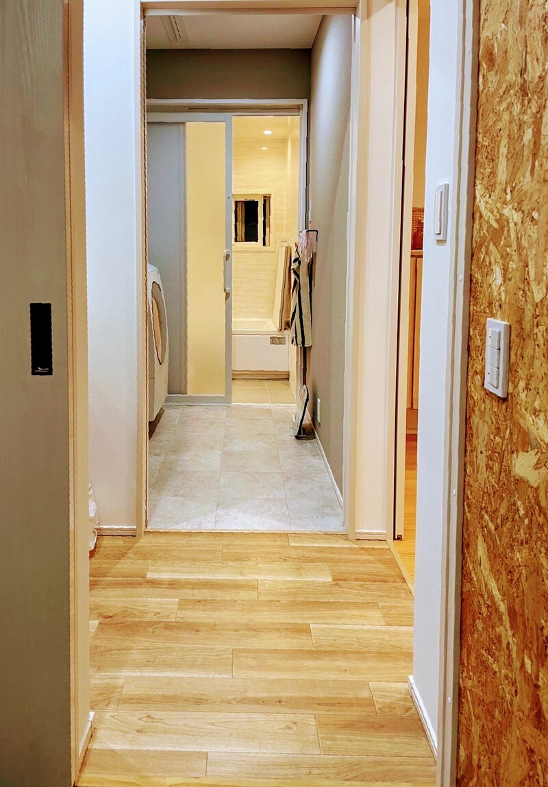 ご主人の趣味である自転車を、外からそのまま収納できる土間スペースを備えた住まいです。土間から物入、洗面、脱衣室、浴室へと一直線につながる便利な動線により、外遊びや趣味の後もスムーズに室内へ移動できます。